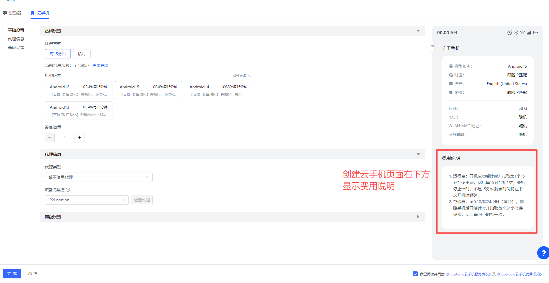 2.1.云手机按分钟使用费用分为运行费用、储存费用两部分;(安卓12、13、15)运行费用0.49元/15分钟,储存费用:0.18元/24小时;(安卓14)运行费用0.39元/15分钟,储存费用:0.18元/24小时。